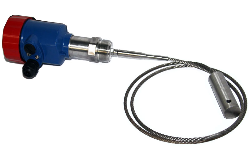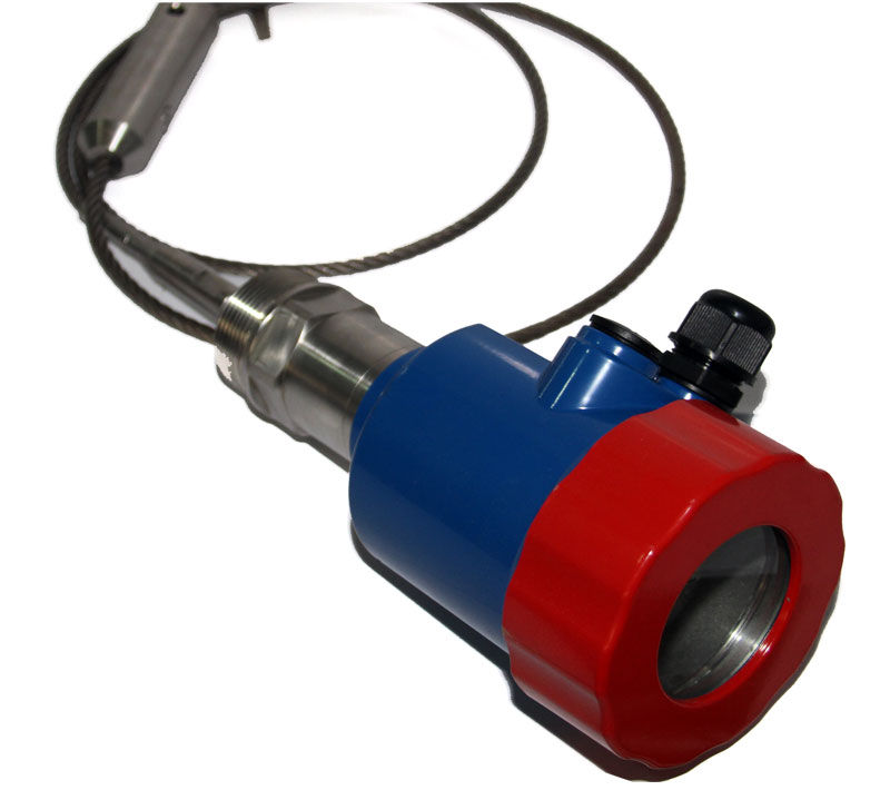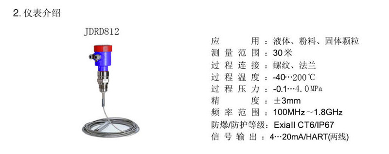 JDRD812纜式導波雷達物位計是基于TDR時域反射原理的一種接觸式物位測量儀表。導波雷達波發出的 高頻微波脈沖以光速沿著探測組件(鋼纜或鋼棒)傳播,當脈沖遇到物料表面時,由于介電常數εr與空氣不同,介電常數突變,就會產生反射,并被儀表接收器接收。 智能軟件對正確的回波識別后,通過微處理器精確控制和計算脈沖運行時間并被轉換成 與距離成正比的4-20mA信號,精度可達毫米級。