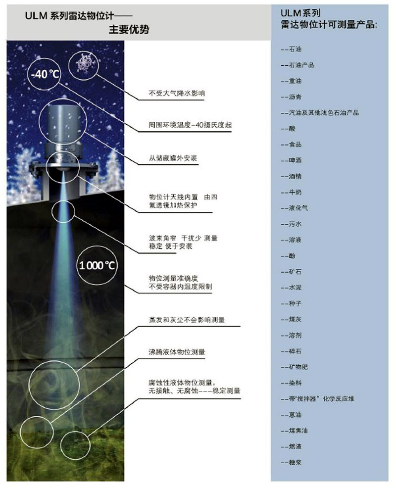 ULM 系列物位計適用于在各種復雜工況下的物位的測量,利馬克公司將會根據您的項目特點、工況和技術要求為您推薦和選擇最適合的雷達物位計和測量方法。